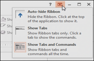 Show Tabs and Commands: This option maximizes the Ribbon. All of the tabs and commands will be visible. This option is selected by default when you open PowerPoint for the first time.
