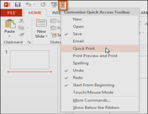 Located just above the Ribbon, the Quick Access toolbar lets you access common commands no matter which tab is selected. By default, it includes the Save, Undo, Repeat, and Start Presentation commands. You can add other commands depending on your preference.