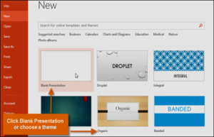 - Select New on the left side of the window, then click Blank Presentation or choose a theme.