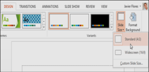 By default, all slides in PowerPoint 2013 use a 16 by 9—or widescreen—aspect ratio. You might know that widescreen TVs also use the 16-by-9 aspect ratio. Widescreen slides will work best with widescreen monitors and projectors. However, if you need your presentation to fit a standard 4-by-3 screen, it’s easy to change the slide size to fit.